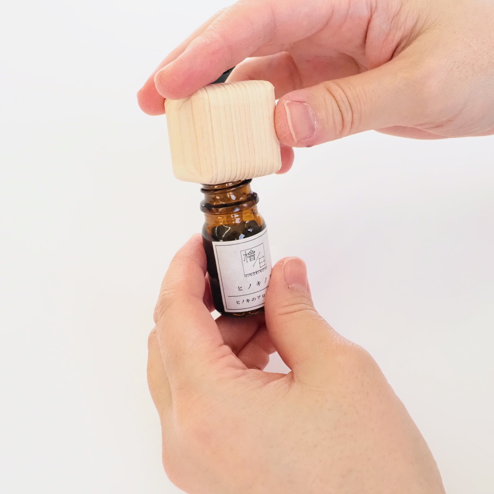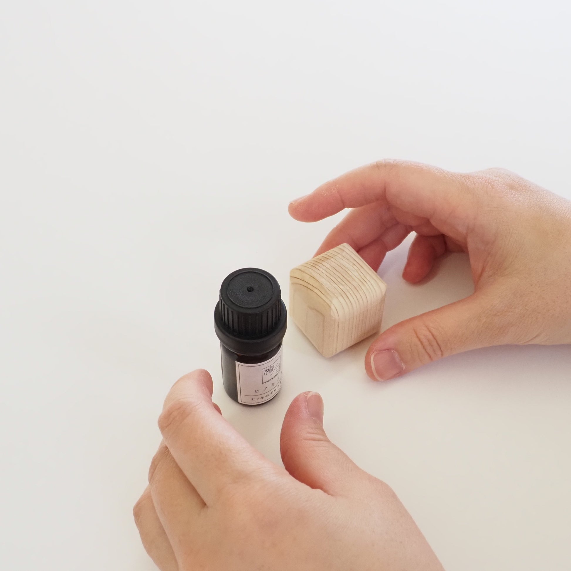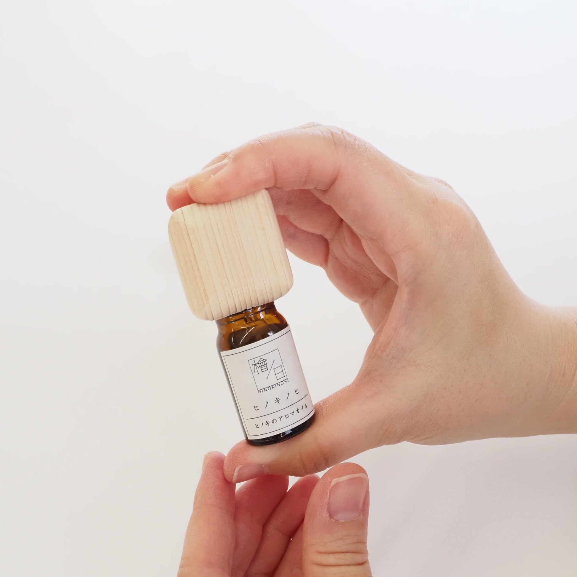 付属のヒノキ精油と組み合わせ、キャップを取り付けて「くるっ」とひっくり返すだけで、木部に香りがしみ込み、枕元やデスクなど小さな空間にふんわりと広がります。