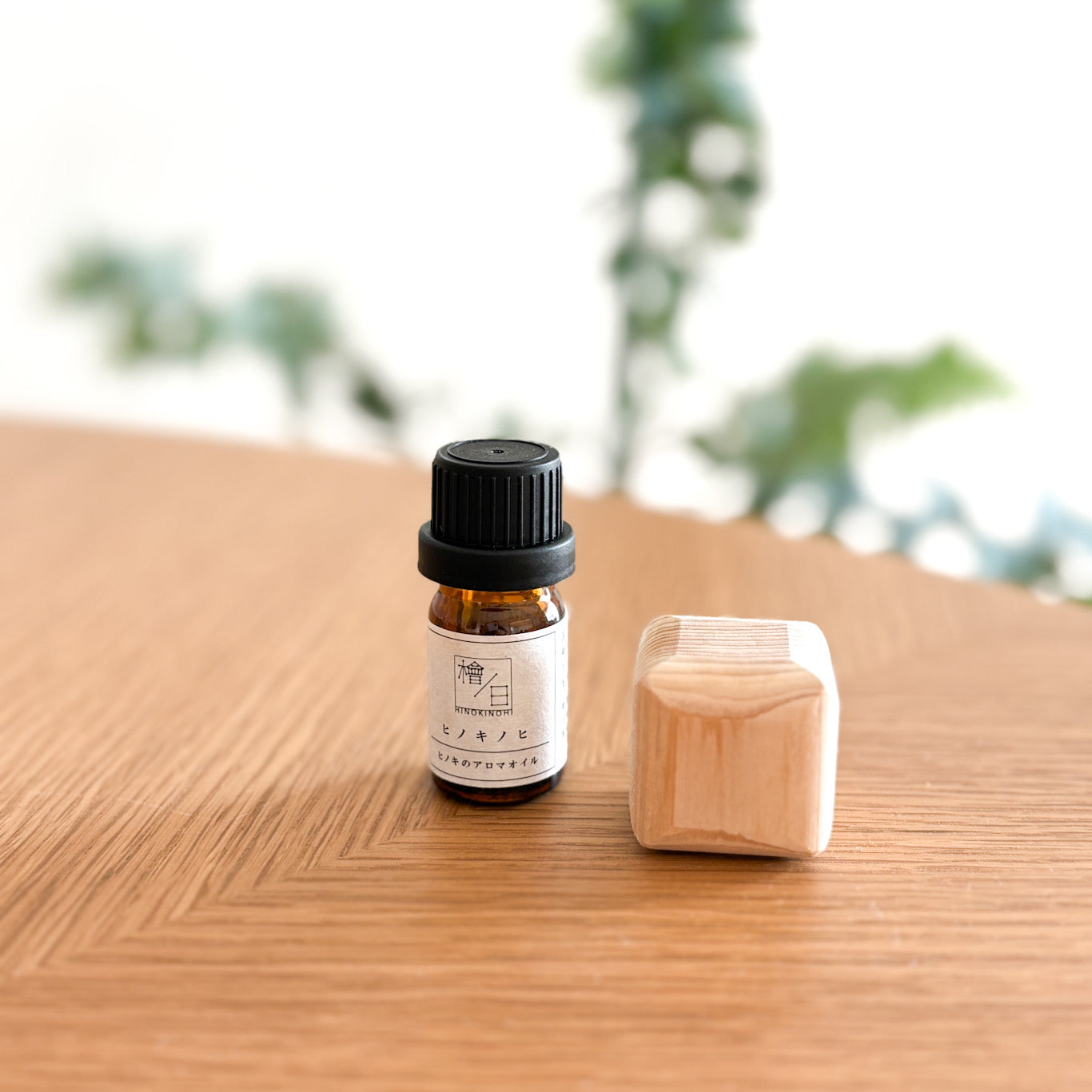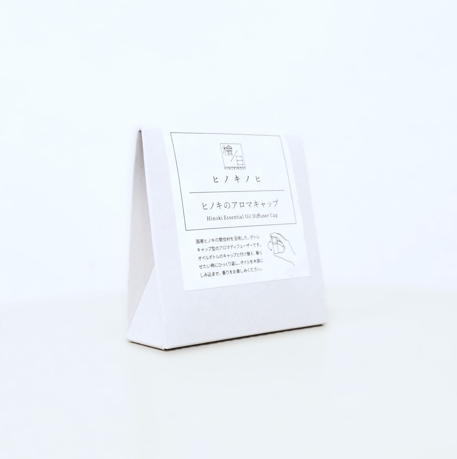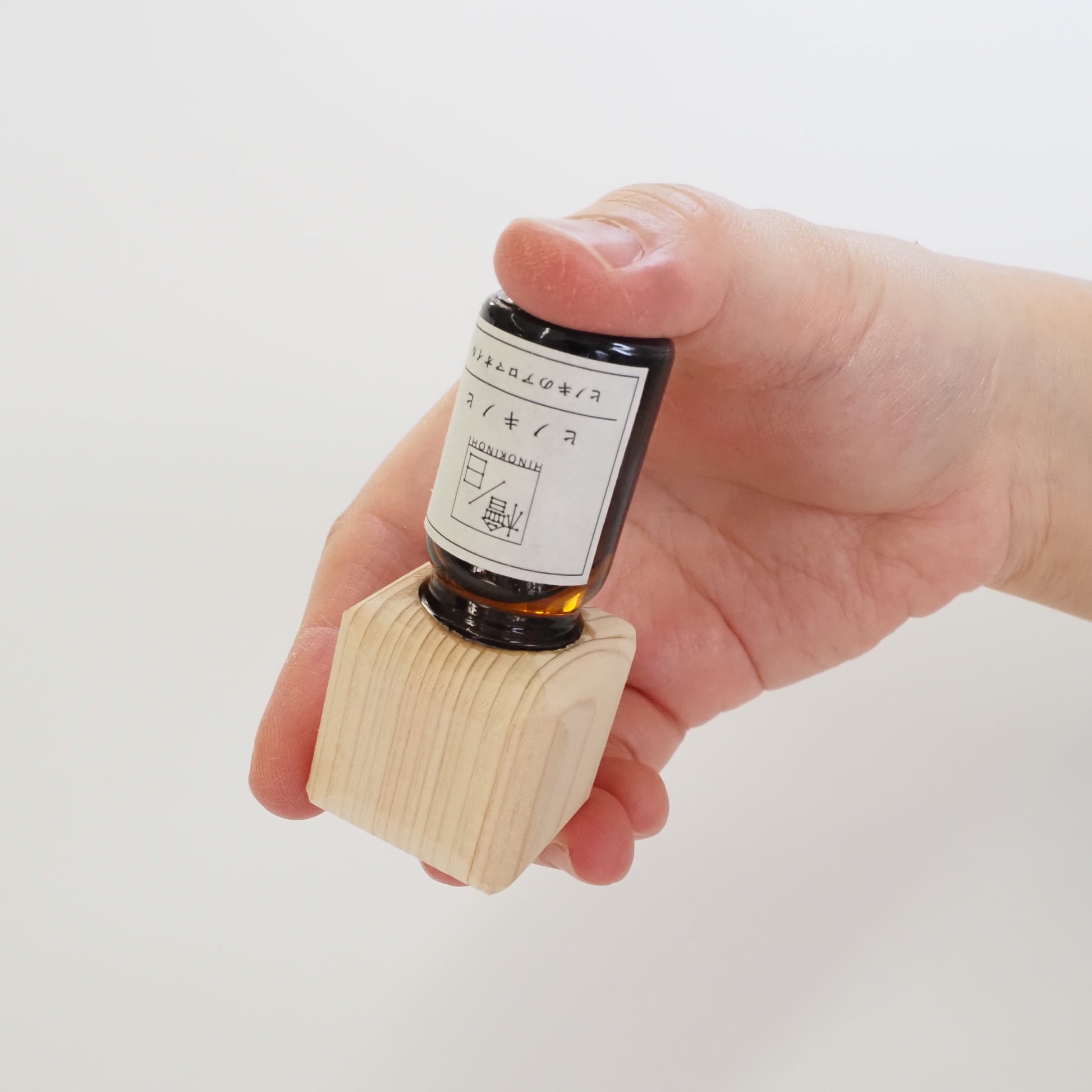 付属のヒノキ精油と組み合わせ、キャップを取り付けて「くるっ」とひっくり返すだけで、木部に香りがしみ込み、枕元やデスクなど小さな空間にふんわりと広がります。